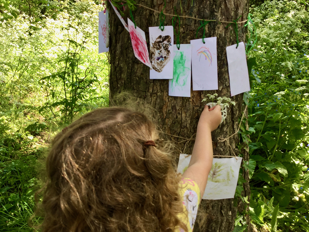 We introduced ourselves to each other by sharing some of our favourite things about this magical space: ‘hearing the birds’, ‘the calm’, ‘exploring’, ‘nature’, ‘making a den’. Together they explored mark making using natural materials and recorded collections and observations through drawing and clay. The morning was rounded off with biscuits and an exhibition of their collaborative work in the Highfields’ ‘Gallery tree’.