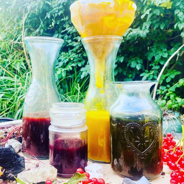 To make the inks - I let the various plants etc sit outside for a while, then gave them a good shake and rinse to remove any insects. Putting them in pans, I covered them with water and let them gently simmer for at least hour - until the colour looked strong - adding a dash of salt and spoon of white vinegar. Once cooled I sieved the ink mix through a funnel into glass bottles, adding gum arabic (one part to 10 parts ink) - a natural ingredient which can be bought in craft shops - and a whole clove to help preserve the mix