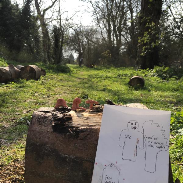 We trialled a joint approach to running artscaper programmes with an artist and therapeutic practitioner with small groups of carefully-chosen children at Thongsley Fields Primary School in Huntingdon and at North Cambridge Academy during 2021. Whilst Thongsley had access to a wild area in its own grounds, NCA students walked to a unique natural space nearby called Highfields, owned and managed by Cambridge City Council for education programmes and now an invaluable resource for this school.