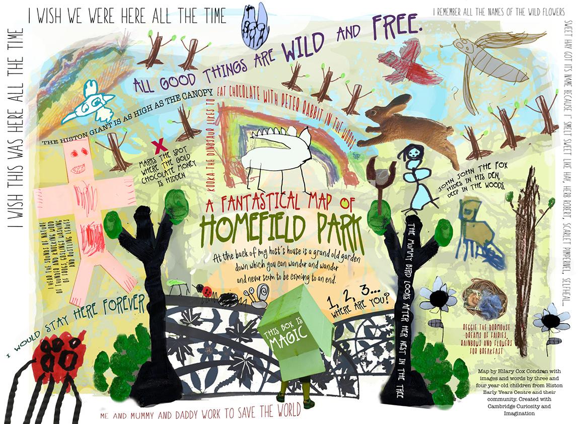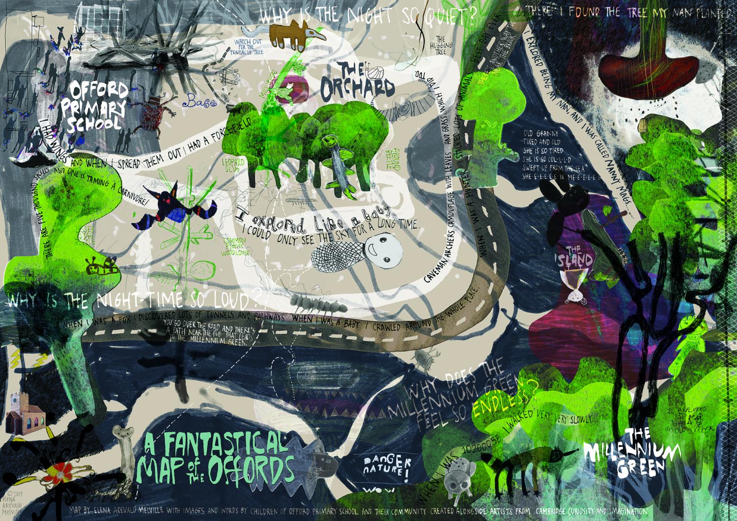 There are now seven maps in this collection - each a re-mapping of an actual landscape by a primary school or early years community, supported to adventure creatively outdoors by CCI artists as part of our Artscapers programme. Many have over 100 layers, tangling together the children’s stories and dreams as well as detailed observations of the world around them. These projects took place in outdoor spaces literally on the schools’ doorsteps - school fields and playgrounds, hedgerows and paths, graveyards, small woods and nature reserves – and each one offered rich opportunities for children to learn together about themselves and the world around them.